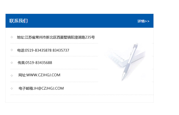 傳真:0519-83435688    郵編:213135    網址:WWW.czjhgj_com.zz-nb.com    電子郵箱:JH@czjhgj_com.zz-nb.com